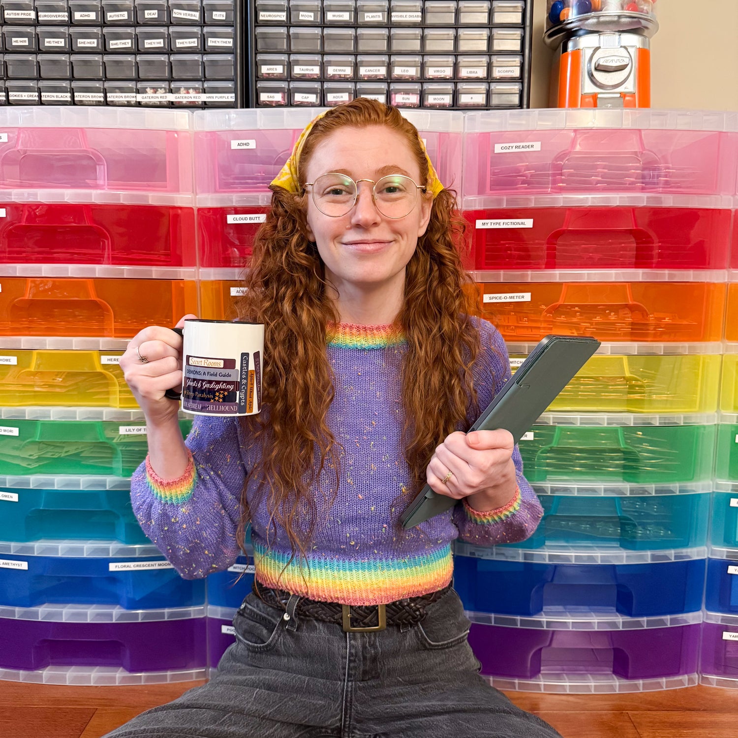 Sarah works for Kitty With A Cupcake as Operations Manager and chaos wrangler. She does a little bit of everything from packing orders, customer service, studio organization, packaging, quality checking products, to traveling the country vending at comic cons, art expos, fiber festivals, creating social media content, and organizing trunk shows.