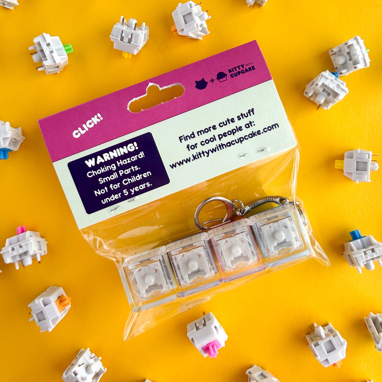This keychain contains real keyboard switches, that means you can also change them to change the sound and feel of your fidget! We even have silent ones for discrete fidgeting! Check out all our switch options here!