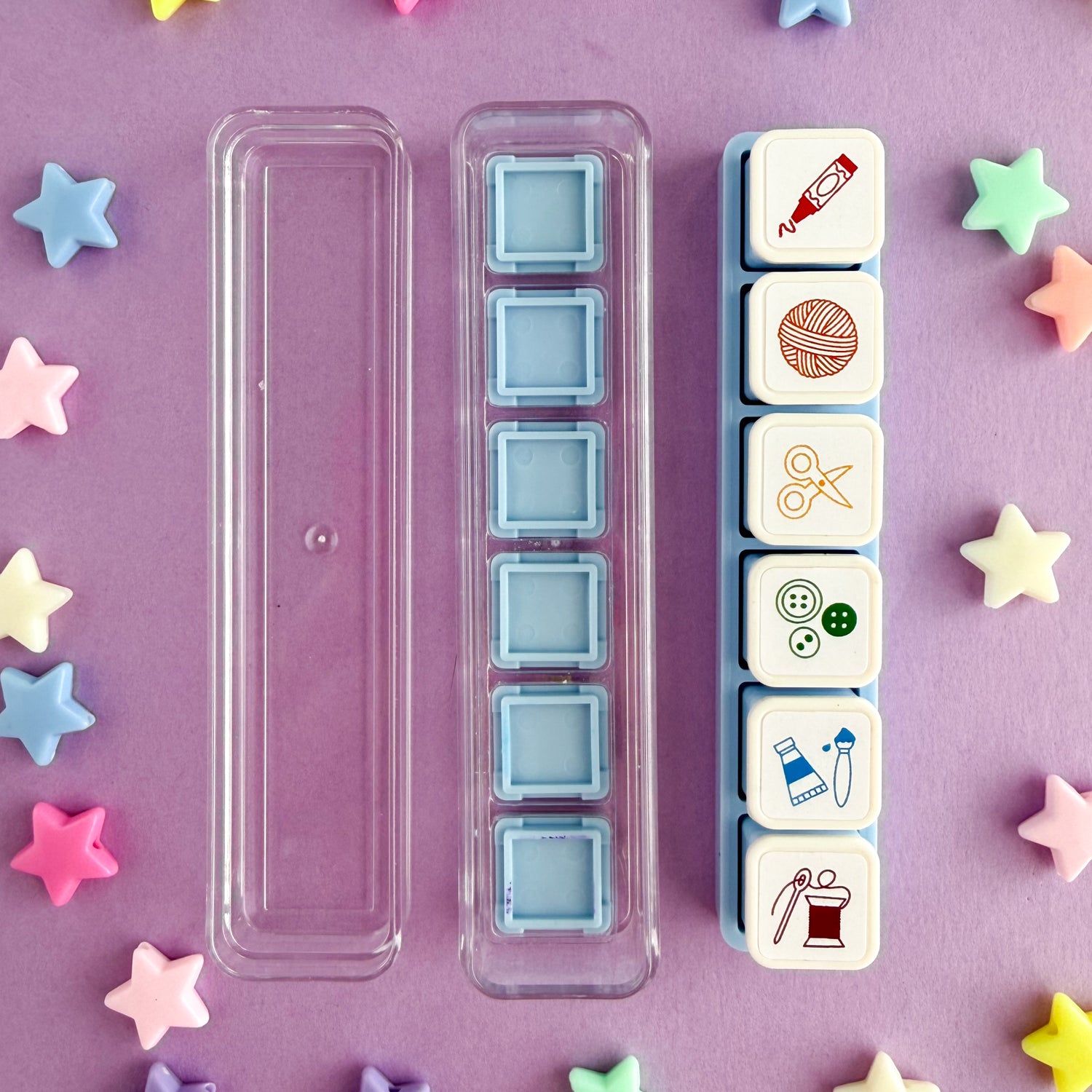 Adorable and easy to use push button stamps featuring cute little crafty illustrations. These stamps are so fun and useful, you just push the button down wherever you want a cute little doodle and you're done! These stamps can be used all in a row together or you can pop out each individual button to mix and match and create your own set. Decorate your crafts journal with some cute little craft icons!